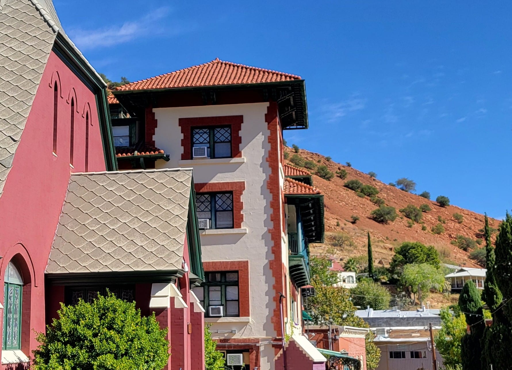Bisbee looks like a storybook mining town built by dreamers who never left. Brick buildings with faded facades cling to steep canyon walls. Narrow staircases double as sidewalks, and every turn offers a new mural, gallery, or shop window glowing with color.