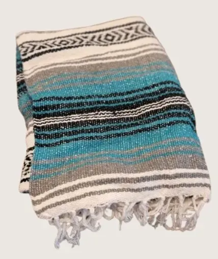 A vibrant and cozy 6’ x 4’ woven blanket, perfect for stretching out under the stars. Made from a durable acrylic-polyester blend with traditional fringe on both ends.