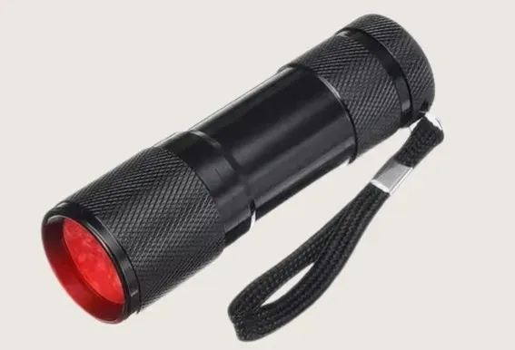A compact 9-LED red light flashlight that preserves night vision. Runs on 3 AAA batteries (not included) and features a wrist strap for convenience.